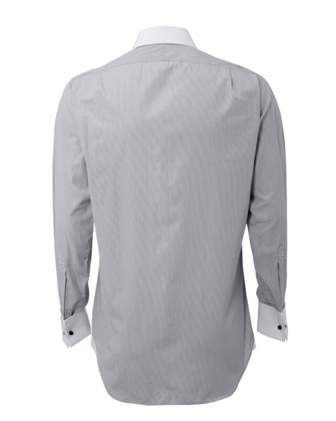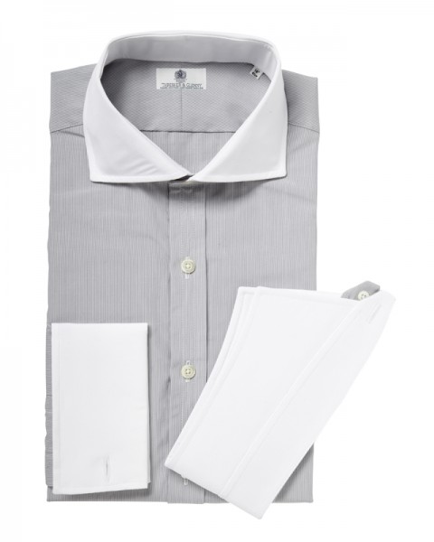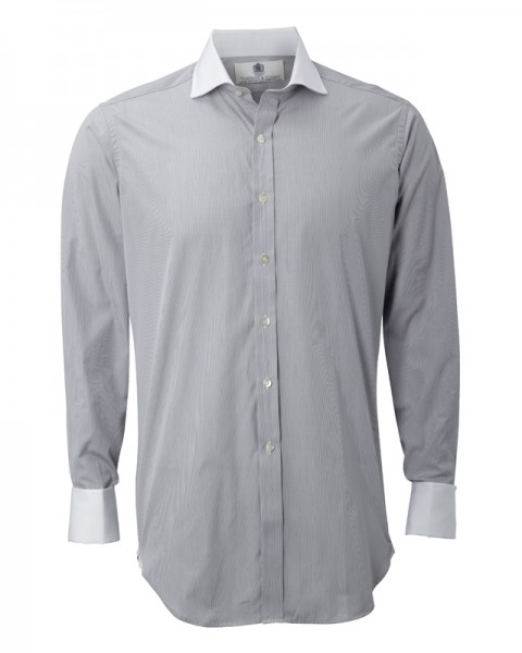 As the plain Jermyn, but with a fine stripe, two white collars, white cuffs and vent piping. Extremely smart.