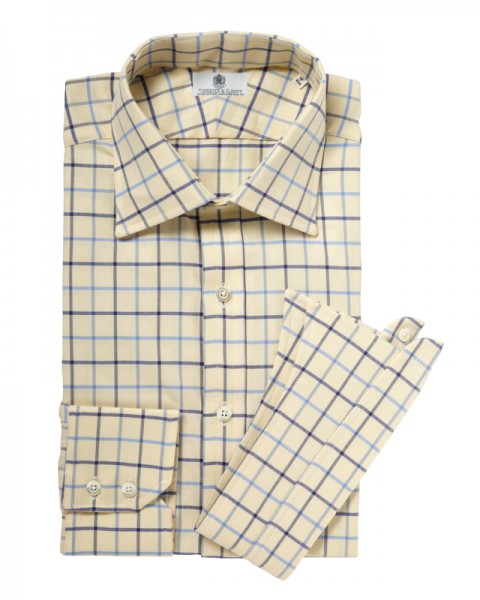 The Glenny country shirt in thirteen warming checks and, for once, a breast pocket. Two-button cuffs, naturally.
